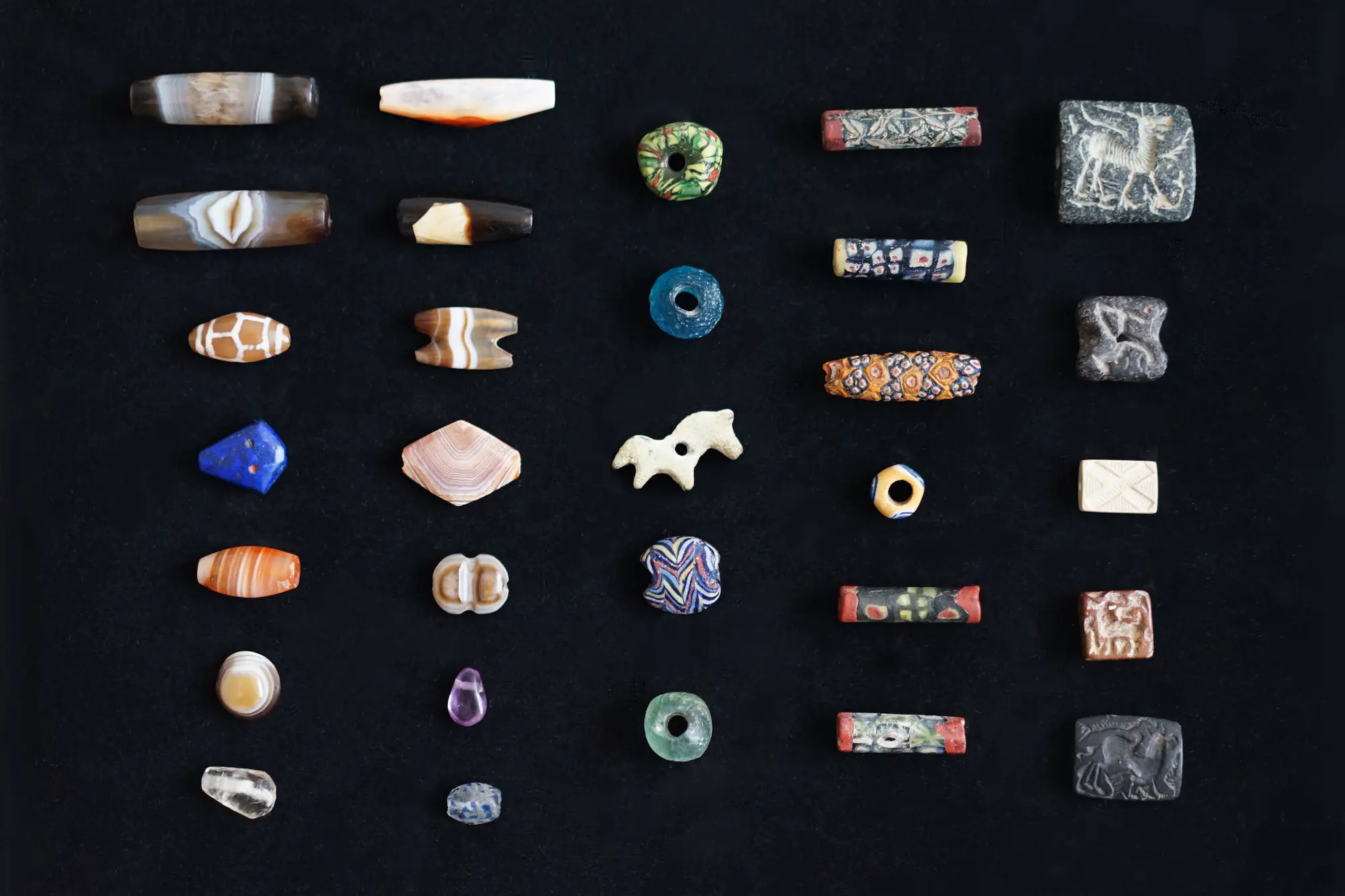 2000年前の古代ローマ期のガラスビーズたちは、作り方も仕上がりもそれはそれは美しく、ガラスとガラスの間に金箔を挟んだゴールド・サンドウィッチビーズや、色の違うガラスを組み合わせたモザイクビーズは、市松模様やスパイラルレースなど、技術的にもとても高度で美しい工芸品です。