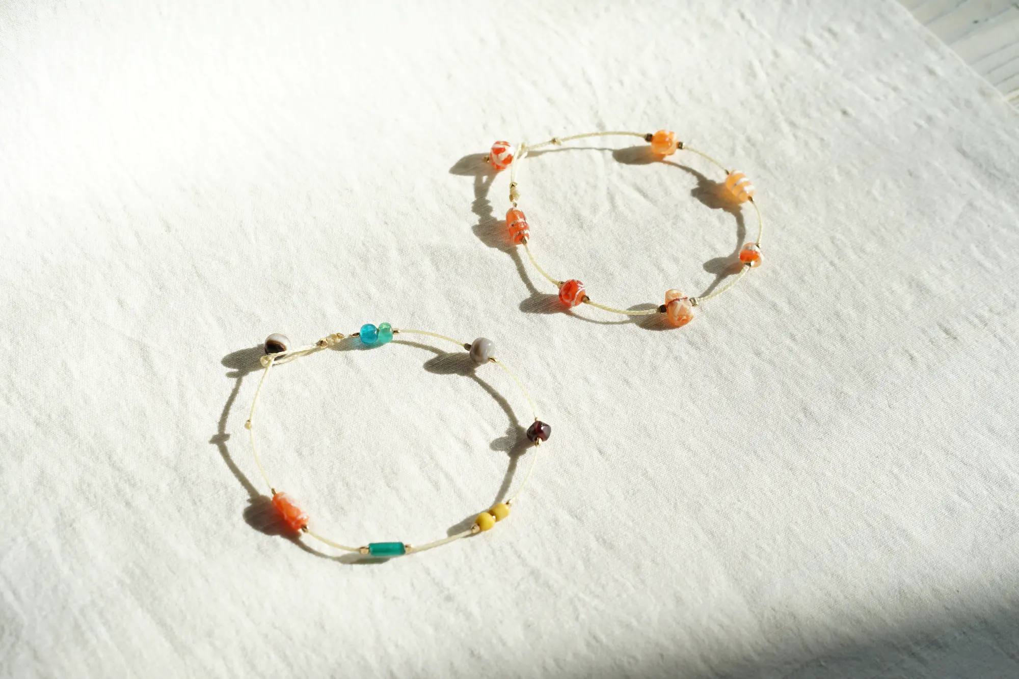 イエローやブルーのビーズは1000〜2000年前のアジアのガラスビーズ、インドネシア・パシフィックビーズ